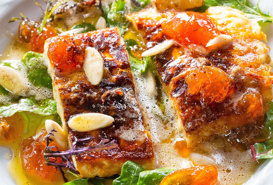 במנה הזאת לקחתי את טכניקת כבישת הלימון שלמדתי מסבתא מסעודה ז"ל ותרגמתי אותה בדרכי לתפוז סיני. יצרתי כבישה מתוקה־מלוחה וחיברתי לג'יבנה שצרבתי בחמאה ומרווה והגשתי עם שקדים. התוצאה היא ביס חלומי ממש.