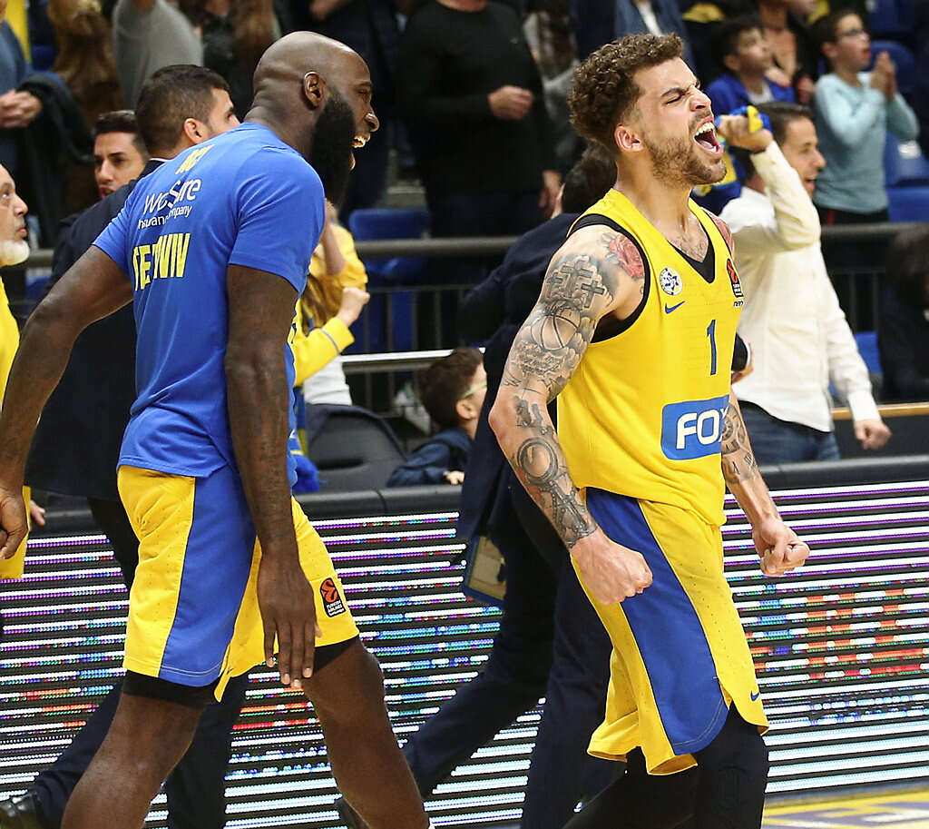 מכבי ת"א חוגגת את הניצחון הדרמטי בהיכל, הערב // צילום: אלן שיבר