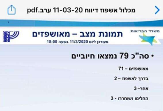משרד הבריאות הודיע הערב (רביעי) על שני מקרי קורונה נוספים שאובחנו בארץ, וכך מספר החולים עלה ל-79, מהם שלושה החלימו. עוד פרסם משרד הבריאות כי חמישה מהחולים שעדיין מאושפזים במצב בינוני וחולה נוסף במצב קשה. משרד החינוך הודיע כי גן עינב בתל אביב יוכנס לבידוד בשל חשש להדבקה.