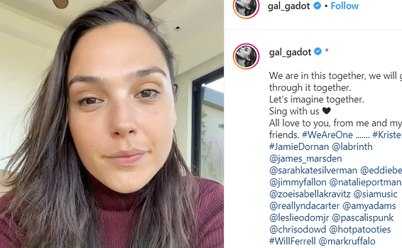 בסרטון מיוחד שיזמה ג׳ניפר גרנר כמה מהאנשים הכי מפורסמים בהוליווד נרתמו להתמודדות במגיפה המשתוללת בכל העולם באמצעות שיר משותף. השיר הנבחר הוא "Imagine" של ג'ון לנון במקור, וכל מפורסם שהשתתף בקליפ תרם משפט אחד מהטקסט המוכר כל כך בקולו.