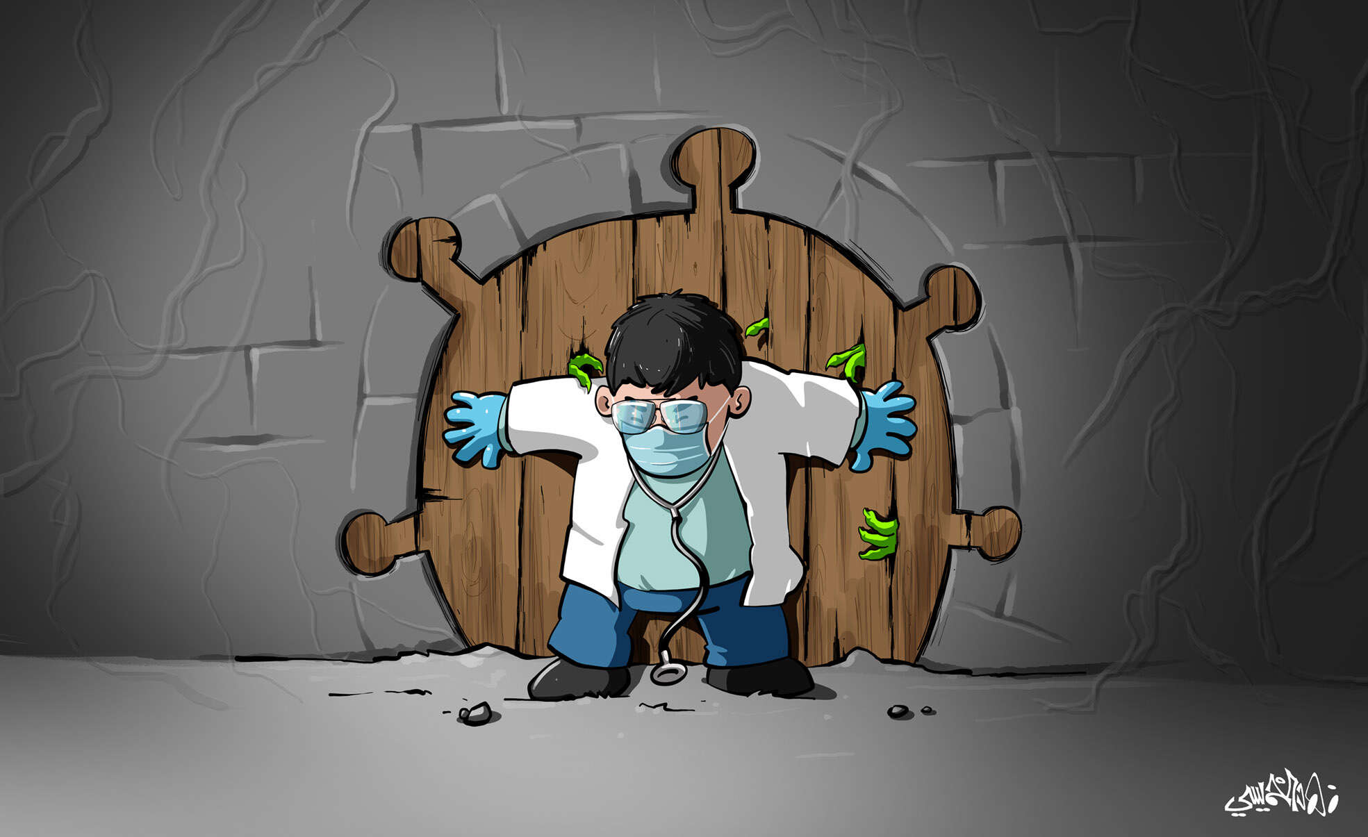 הפעם תורו של פַהֶד אל-חַ'מִיסִי, קריקטוריסט הבית של העיתון הכלכלי הסעודי, אל-אִקְתִצַאדִיַה. בקריקטורה אנחנו רואים איך הרופא, שמייצג את צוותי הרפואה מנסה למנוע מהקורונה לפרוץ מהדלת בצורה של נגיף הקורונה.
