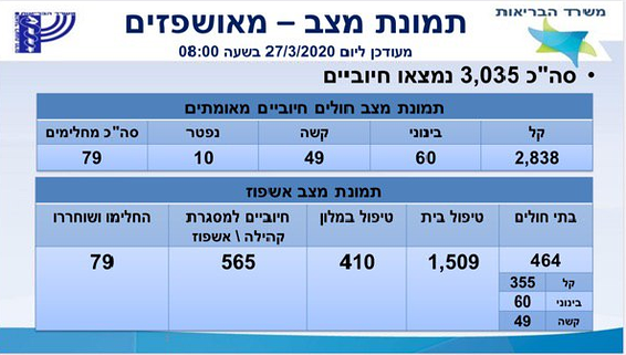 לפי נתוני משרד הבריאות שהתפרסמו הבוקר ומעודכנים לשעה 08:00, יש בישראל 3,035 בני אדם שאוחבנו כחולים בקורונה, כשמתוכם 2,838 נמצאים במצב קל, 60 במצב בינוני, 49 במצב קשה כשמתוכם 38 מונשמים, ו-79 בני אדם שהחלימו מנגיף הקורונה.