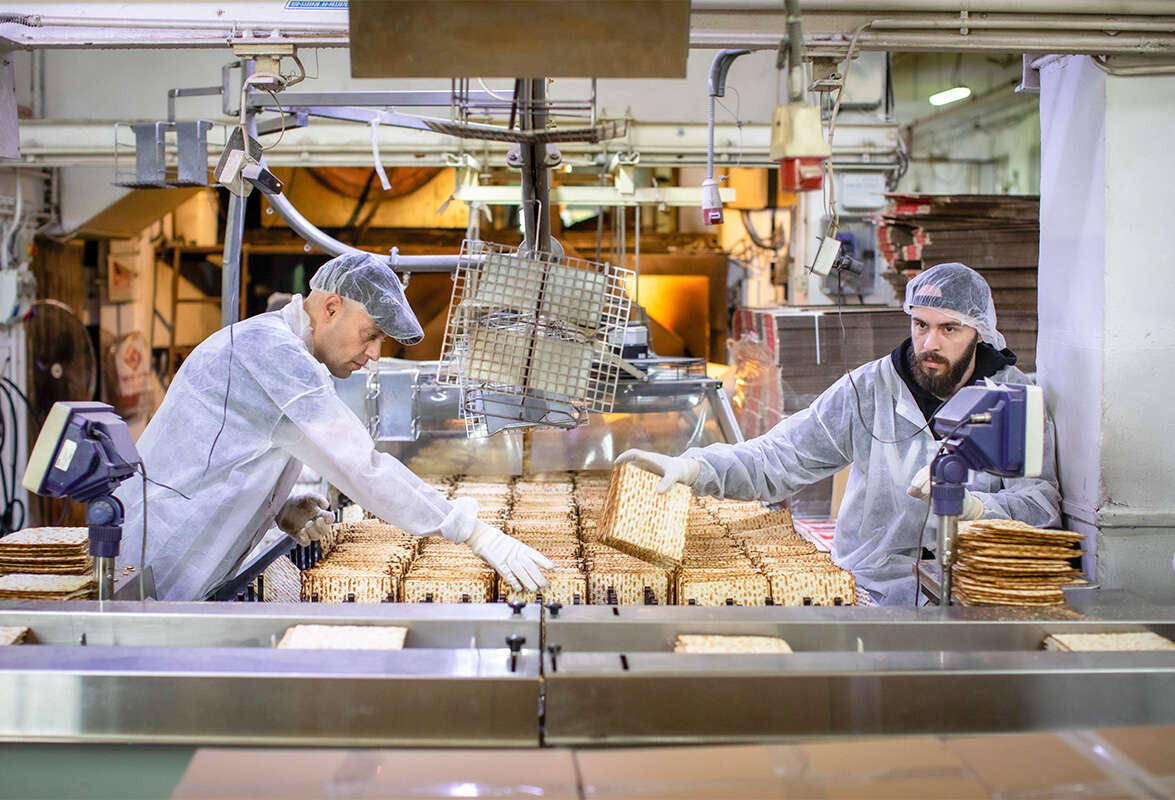 40 איש עובדים במפעל בקביעות, ולקראת הפסח הם תופחים ל־100. בימים כתיקונם עובדים במשמרות של שמונה שעות, אבל עכשיו חולקו העובדים לשני צוותים, שעובדים 12 שעות כל אחד, וכל מגע בין הקבוצות נאסר. רק אחרי שמשמרת אחת עוזבת את אולמות הייצור, נכנסת השנייה. המפעל נמצא השנה בתפוקה גבוהה מהרגיל, כי כל הישראלים בבית, והביקוש עלה. זו פעם ראשונה בתולדות המפעל שהוא נכנס לעבודה גם בימי שישי, עד שעות הצהריים.
