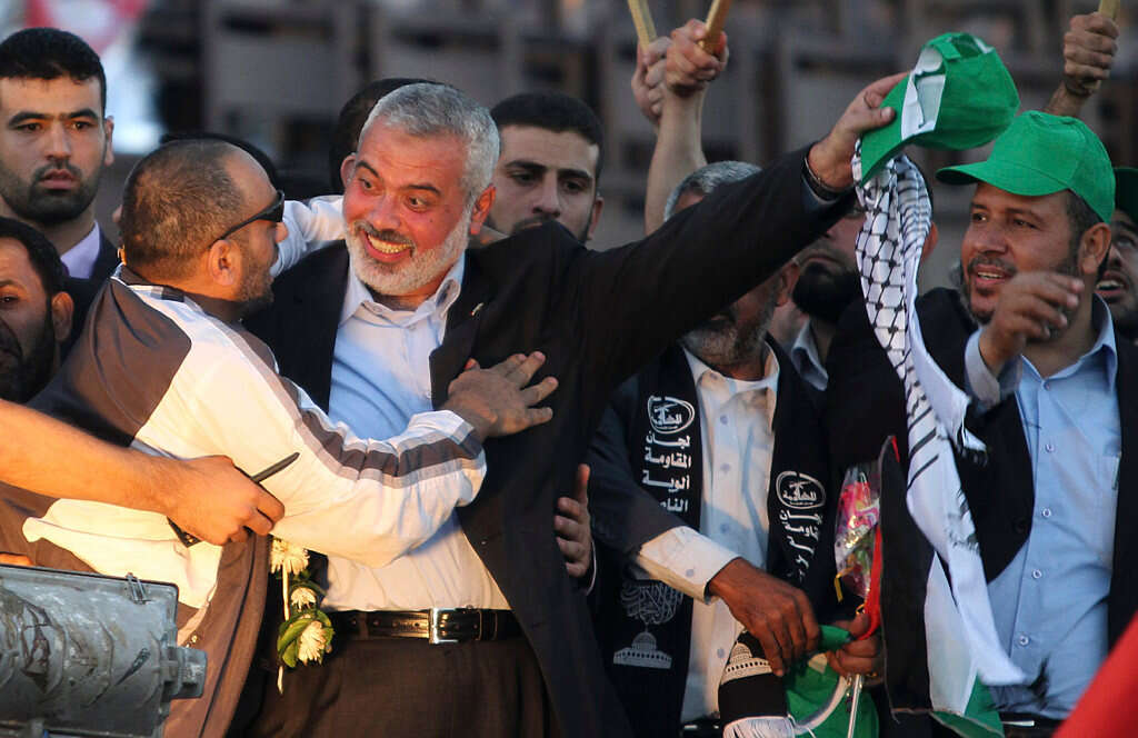 מנהיג חמאס יחייא סינוואר מקבל בעזה את פניו של אסיר פלשתיני ששוחרר // צילום: AP