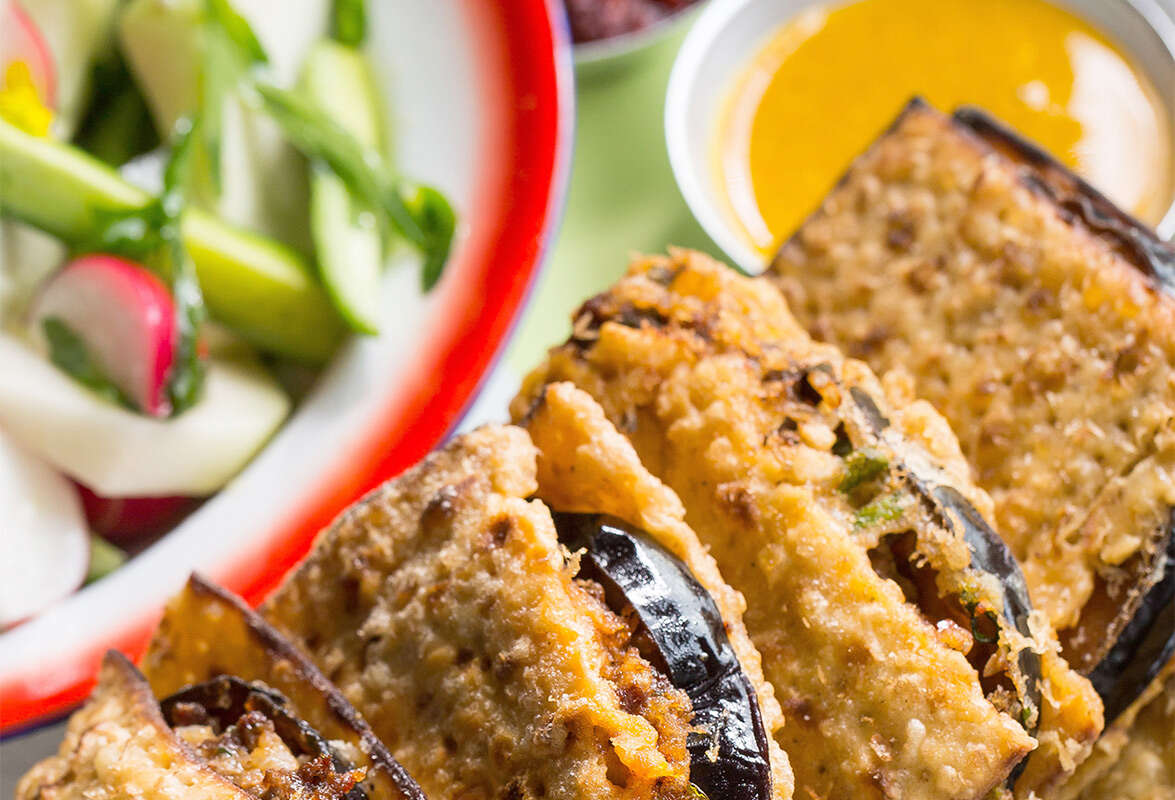 הכנת החציל: מערבבים את הקמח והמלח בקערה, מצפים את פרוסות החציל בקמח, מנערים, מטגנים בשמן עמוק כ־2 דקות עד הזהבה ומוציאים לנייר סופג.