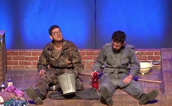 והפעם: ההצגה "שניים על גג אחד" - שני חיילים משני צבאות מוצאים את עצמם לכודים על גג אחד כאשר מסביבם הכל מים. תחילה הם מנסים להילחם זה בזה, אך הרצון לחיות גובר. הם מנסים לתקשר זה עם זה, אך הם לא מדברים את אותה השפה. הצורך במציאת פתרונות יצירתיים והרוח האנושית יובילו את השניים לנסות ולהבין את האחר ולהתקרב עד לרגע הפרידה.