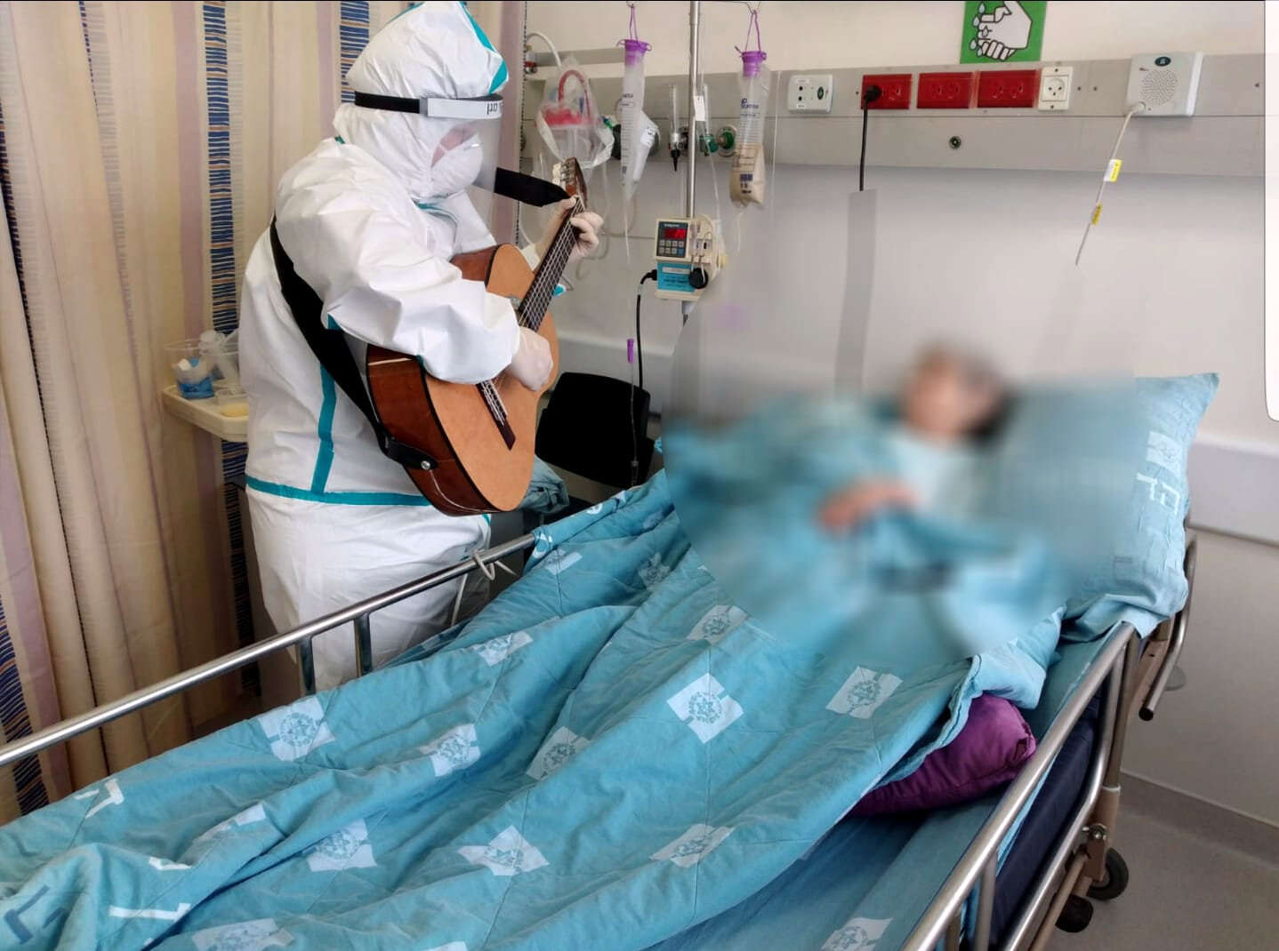 אחת המטופלות (בתמונה) היא חולת קורונה בת 93 לאחר אירוע מוחי, הסובלת גם מדמנציה ואינה מתקשרת. את אחד השירים, שאותם ניגנה כשהיא בסרבל, עם קסדה וכל ציוד המיגון, הקדישה מדסון־גרוסמן לאותה אישה. "תוך כדי הנגינה היא התחילה להרים ולהזיז בתנועת ריקוד את היד שלה שעובדת. כשסיימתי והחזקתי לה את היד, היא משכה אותה אל הפה ונתנה לה נשיקה. הדמעות ירדו מעצמן", סיפרה.