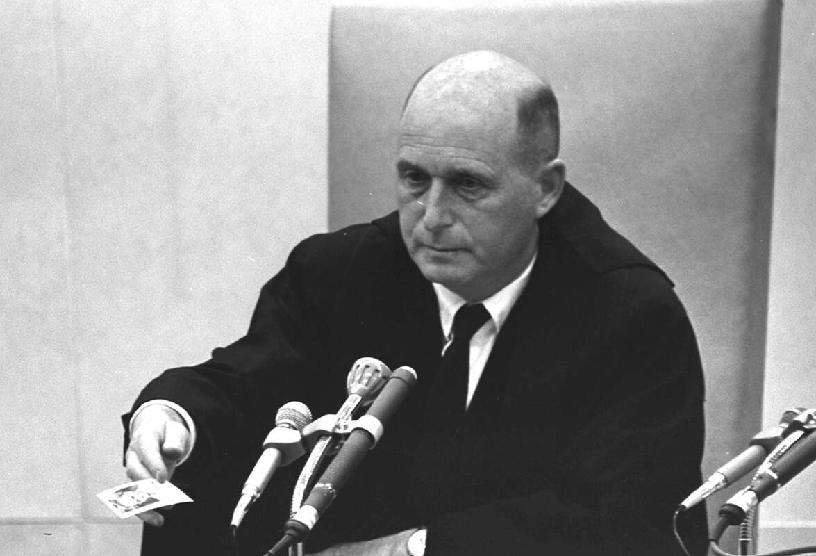 השופט משה לנדוי בבית המשפט המחוזי, במהלך משפט אייכמן בשנת 1961 // צילום: לע"מ // השופט משה לנדוי בבית המשפט המחוזי, במהלך משפט אייכמן בשנת 1961