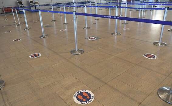 בביקור בנתב"ג, ניתן לראות שדה תעופה שונה. הרצפות מלאות במדבקות במרחק של שני מטרים זו מזו. על המדבקות כתוב באנגלית, בערבית ובעברית "אנא המתן כאן", כדי שעוברים ושבים ישמרו על המרחק המתבקש, גם בתורים הארוכים ביותר.