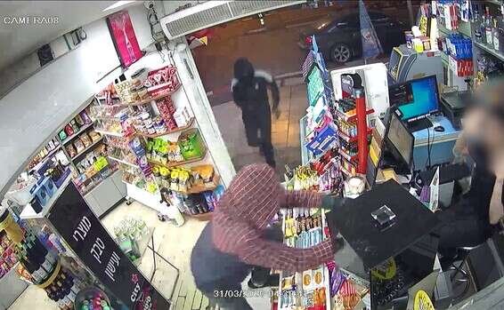 תיעוד שנלכד בעדשת מצלמת האבטחה: החשודים נכנסים לפיצוצייה ובזמן שאחד מהם מכניס את המוכר למחסן ושומר עליו, האחרים עוקרים את הקופה ממקומה וגונבים כסף מזומן וסיגריות.