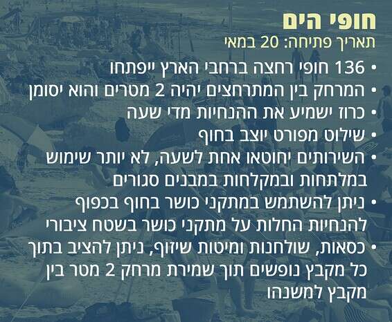למרות שחופי הים בישראל היו גדושים בעשרות אלפי אנשים, בניגוד לתקנות, במהלך הימים האחרונים, רק היום נפתחה עונת הרחצה באופן רשמי. היום ייפתחו 136 חופים ברחבי הארץ - צעד שנעשה כחלק ממתן ההקלות לפתיחת המשק עם שוך מגפת הקורונה, שמצד אחד מאפשרות לשוב לגרה כמעט רגילה, אך מצד שני מטילות מגבלות של שמירת מרחק וחיטוי במקומות השונים.
