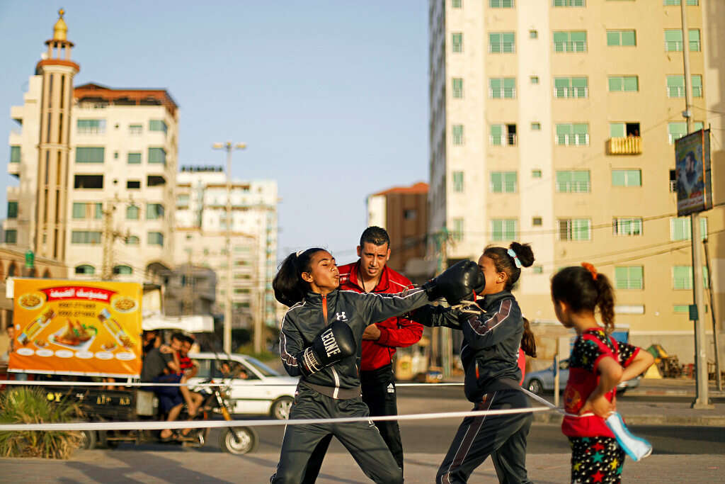 מתאגרפות צעירות בעזה, חלקן רק בנות ארבע, התאמנו השבוע על חוף הים לאחר שמועדון האגרוף שלהן נסגר בשל מגפת הקורונה. המראה של בנות עם מסכות פנים מתאגרפות על החוף תפס את עיני העוברים והשבים בעיר, בה ספורט האגרוף פופולרי בעיקר בקרב גברים.