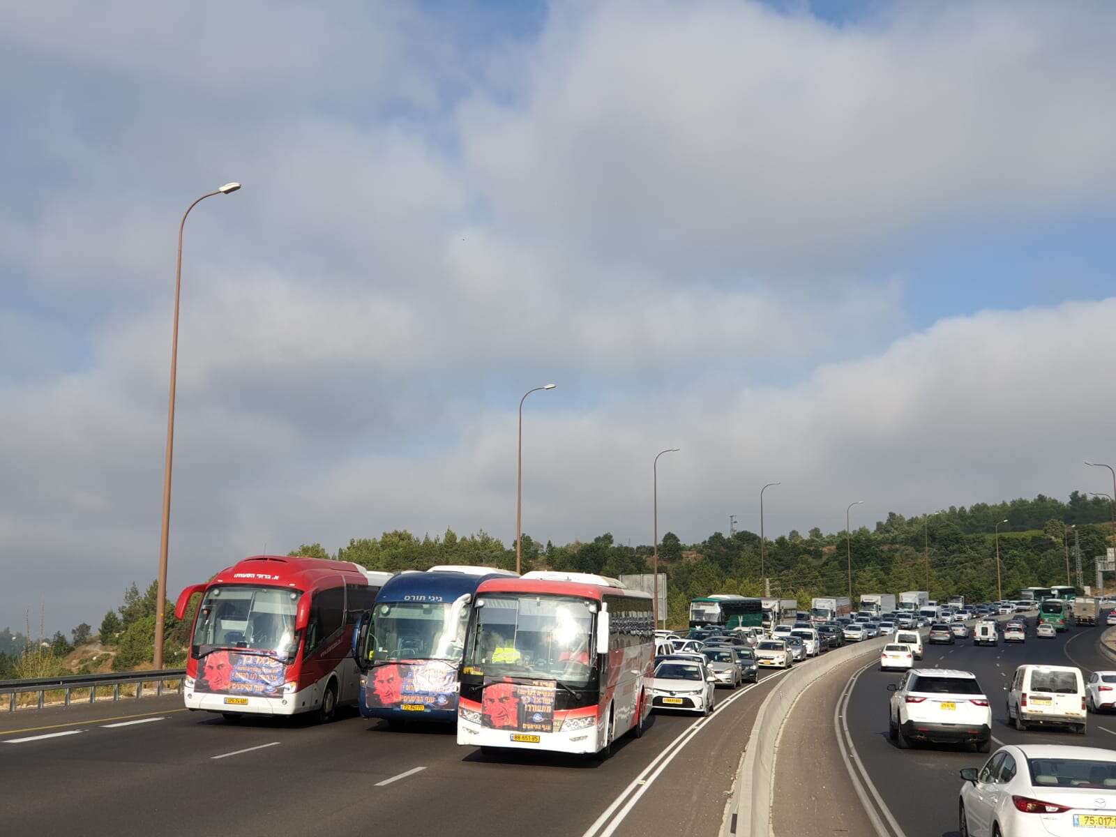 עשרות אוטובוסים בשעה זו את העלייה לירושלים כחלק ממאבק חברות ההסעה הפרטיות. החסימה מאזור נווה אילן יוצרת עומסי תנועה כבדים בכביש 1. על האוטובוסים מודבקות מדבקות ענק עם תמונתו של שר האוצר ישראל כץ והכיתוב: "30 אלף נהגים עומדים במקום. ענף ההסעות בקריסה!".