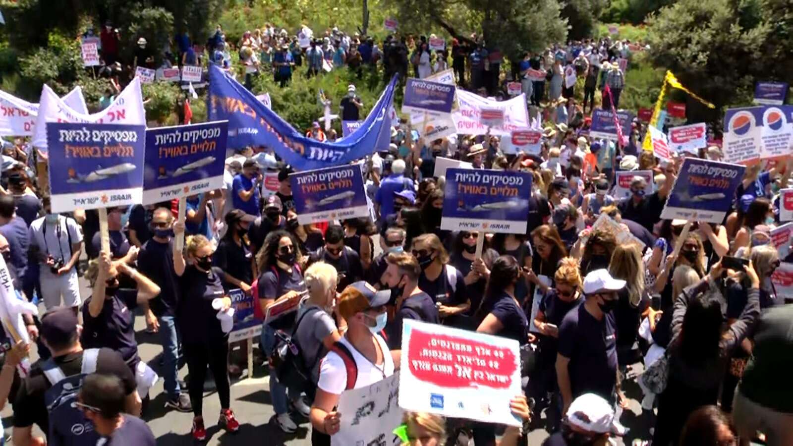 אלפי עובדי ענף התיירות, שנפגע בצורה אנושה בחודשים האחרונים, מפגינים בשעה זו (שלישי) מול משרד האוצר בקריאה לקבוע תאריך לפתיחת השמיים, להציע מתווה ולדאוג לעתידם הכלכלי.