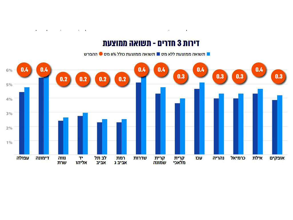 "מהבדיקה עולה כי אם מס הרכישה אכן יבוטל, העלייה בתשואת השכירות בפריפריה תעמוד על 0.3-0.4% בלבד - גם בדירות 3 חדרים וגם בדירות 4 חדרים", אומר איתן זינגר, מנכ"ל מדלן. "זאת לעומת עלייה של 0.2% בתשואה במידה ומס הרכישה היה מבוטל בתל אביב.