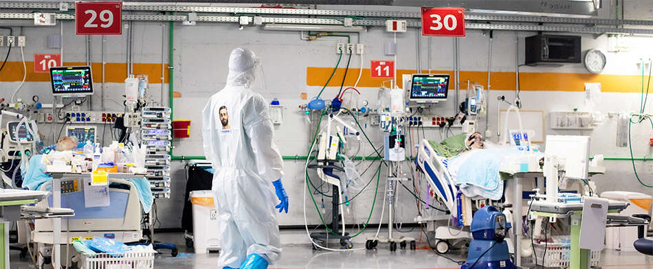 בכלל, המשפחות כאן נעדרות. את מקומן מחליפים מסכי הטלוויזיה והרמקולים המפורסמים, המאפשרים לאנשי הסגל הרפואי לעקוב אחר המאושפזים. כשהם נדרשים להיכנס, הם עוצרים בעמדת ההלבשה, עוטים בזהירות סרבל, מסיכת פה ואף, שעליה כיסוי ראש ופנים גדול, וגם ערדליים.
