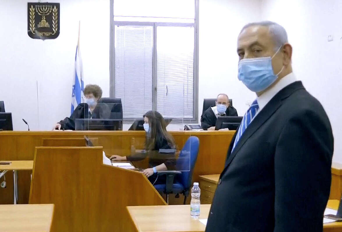נתניהו נכנס לאולם בית המשפט לפתיחת משפטו, מאי 2020 // צילום: רויטרס