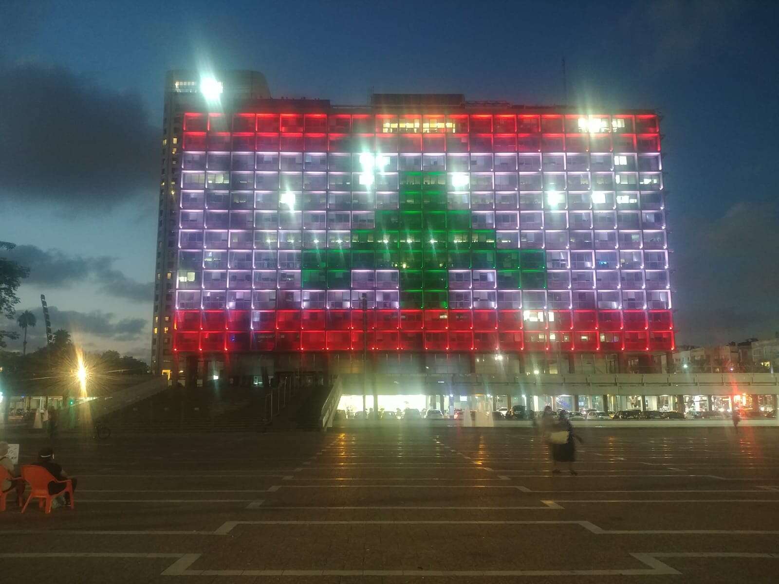 עיריית ת"א האירה הערב (רביעי) החל מהשעה 20:00 את בניין העירייה בצורתו של דגל לבנון.