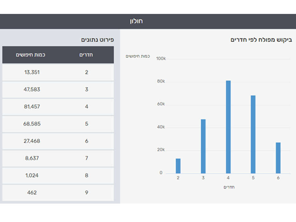 דירות 4 חדרים הן הנכס המבוקש ביותר בחולון עם כ-33% מכלל הביקושים בעיר ועם יותר מ-81,000 חיפושים בשנה האחרונה.