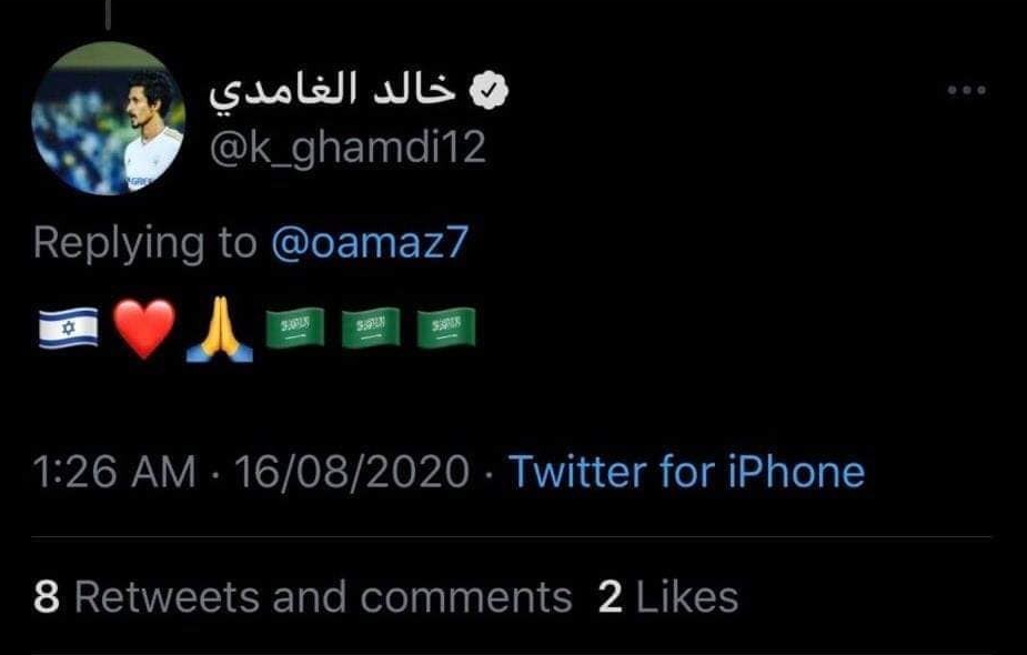 האחרון העלה לחשבון הטוויטר שלו את דגלי ישראלי וערב הסעודית, כשביניהם לבבות עם אימוג’י של תפילה, אך המחווה של אל חאמדי עוררה גל של ביקורות, ולמעשה עוררה סערה לא קטנה.