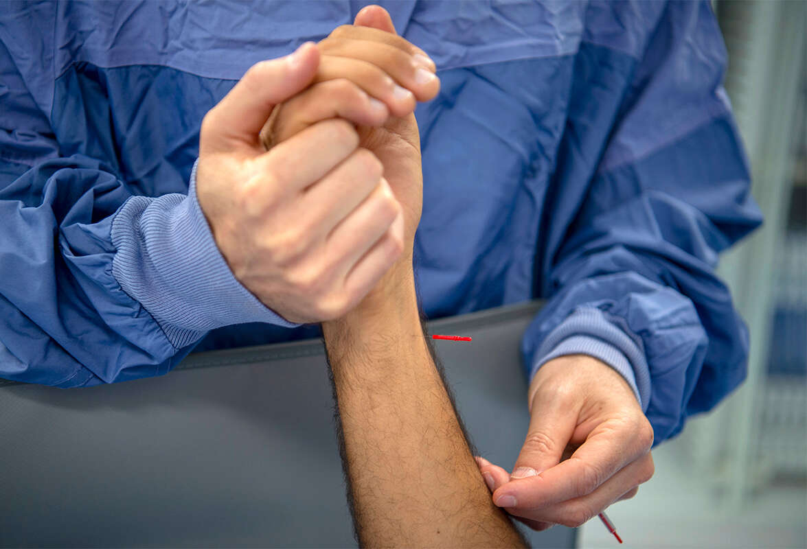 באותו זמן מתבצע במחלקה לרדיולוגיה פולשנית צנתור כירורגי. מלבד שלל מכשירים רפואיים שהמטופל מחובר אליהם, נעוצות בגופו שמונה מחטים מסוג אחר: מחטי דיקור סיניות. המטופל נמצא בהרדמה אזורית בלבד, ובזכות המחטים אינו זקוק לתרופות טשטוש. הוא ערני וקשוב להנחיות הרופא המצנתר ושאר הצוות הרפואי. רק בסוף ההליך, לפני שיועבר לאשפוז במחלקה, יוצאו ממנו המחטים.