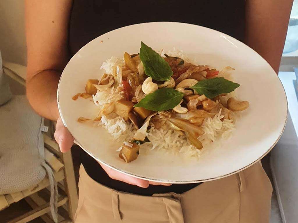 "אני משתדלת מאוד להכין בבית מנות ללא מזון מן החי. חשובה לי החשיפה של הילדים למקורות אחרים של חלבון, ואנחנו אוכלים אותן יחד. אחת המנות הכי כיפיות להכנה והכי קלילה היא מנת מוקפץ. היא מכילה את כל אבות המזון הנדרשים. אפשר לאלתר עם הירקות ולשנות את המתכון כראות עיניכם. בנוסף, ניתן ליהנות מההכנה ומהאכילה המשותפת עם הילדים".