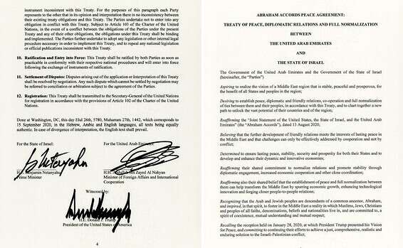 חוזה שלום בן שבעה עמודים נחתם בין ישראל לבין איחוד האמירויות. הוא מפרט את תחומי שיתוף הפעולה ששתי המדינות מבקשות לקדם יחדיו. רק בהסכם זה הפלשתינים מאוזכרים ואולם באופן כללי מאוד. שני הצדדים מתחייבים "להשגת הסדר לעימות הישראלי-פלשתיני בדרכי מו"מ שעונה על הצרכים הלגיטימיים והשאיפות של שני העמים וכדי לקדם שלום כולל, יציבות ושגשוג במזרח התיכון".