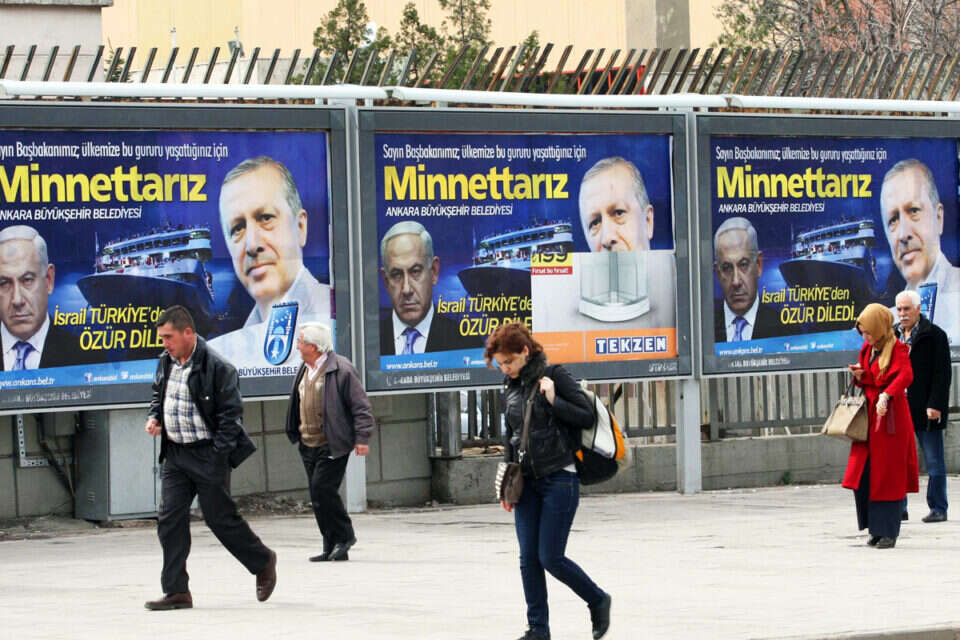 ביטוי לשימוש הפוליטי שעושה ארדואן בהתנצלות הישראלית היה אפשר לראות שלשום ברחובות אנקרה הבירה, שם נתלו שלטי חוצות מטעמה של העירייה המקומית שבהם נכתב "אנו מכירים לך תודה". בשלטים מופיעה תמונה גדולה של ארדואן לעומת תמונה מוקטנת יותר של נתניהו.