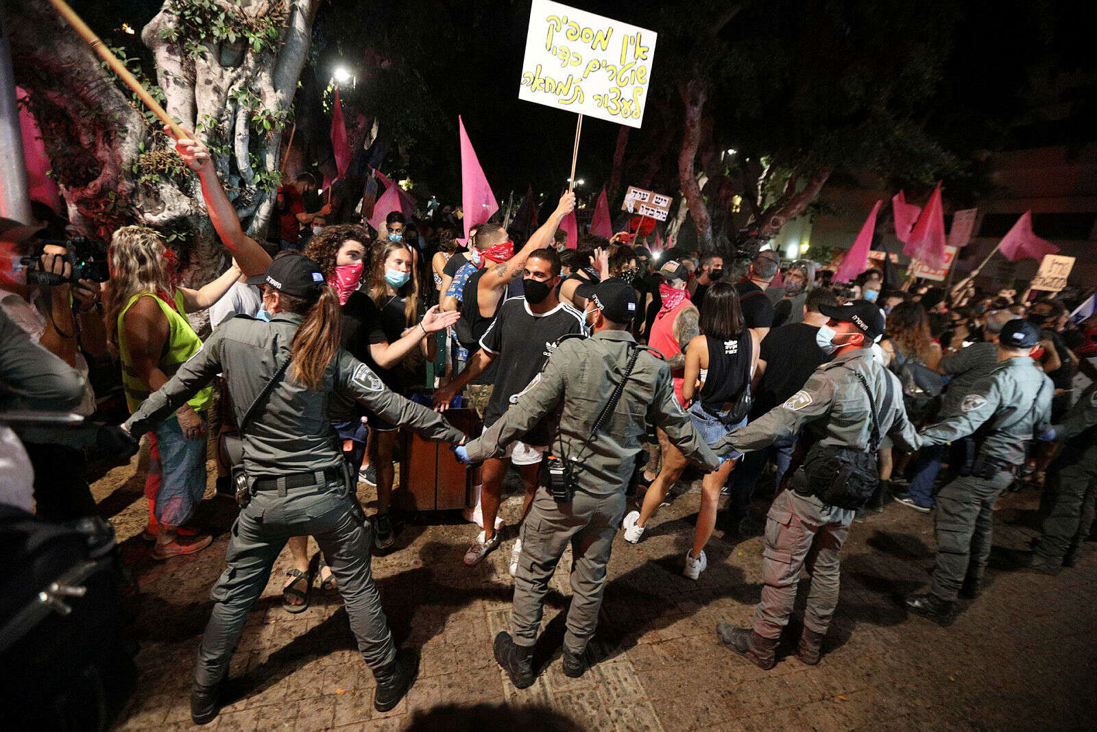 מפגינה בשנות ה-20 לחייה היכתה שוטר בתל אביב הלילה (שישי) לאחר שהתבקשה לעטות מסכה וסירבה. היא נעצרה ונלקחה לחקירה במשטרת המחוז.