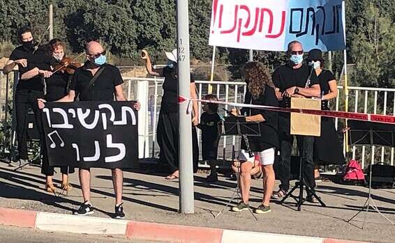 "לא ניתן לילדים לשכוח מהי תרבות": כ-100 מוסיקאים הפגינו הערב (שישי) מול ביתו של שר התרבות והספורט חילי טרופר בנס הרים במחאה על המשך איסור ההופעות בשל משבר הקורונה. המפגינים, שבאו עם כלי הנגינה שלהם, קיימו "חזרה" בדרך להפגנה ואף שילבו קטעי נגינה במחאה מול ביתו של השר.