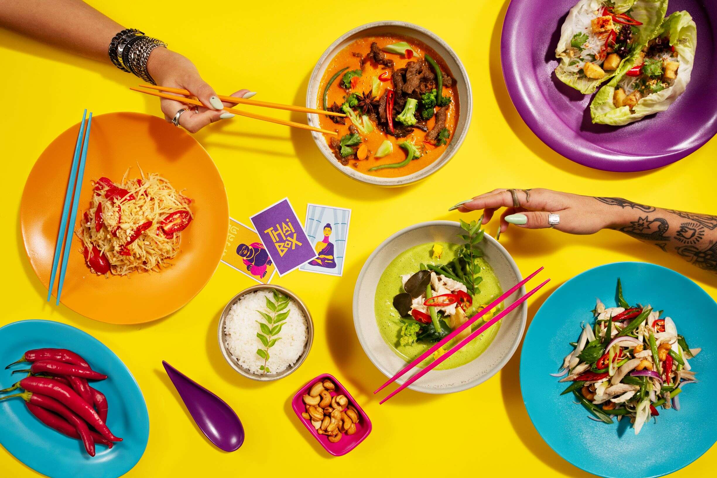 ואחרי כל התיאורים, מה אוכלים? התשובה היא המון אוכל תאילנדי, רובו חריף, שממש לא מתחנף לחך הישראלי אלא נשאר אותנטי ונאמן למסורת התאילנדית. על התפריט אחראי השף הונג אנג צואנג לצד לי פן, מבעלי המסעדות פקין ופיצה פיל, שנחשב למומחה באוכל אסיאתי. בגזרת הקינוחים טיפל מולי בראל בכר, שהעניק פרשנות משלו לקינוחים תאילנדים מוכרים הפך אותם ל"עוברי משלוח".