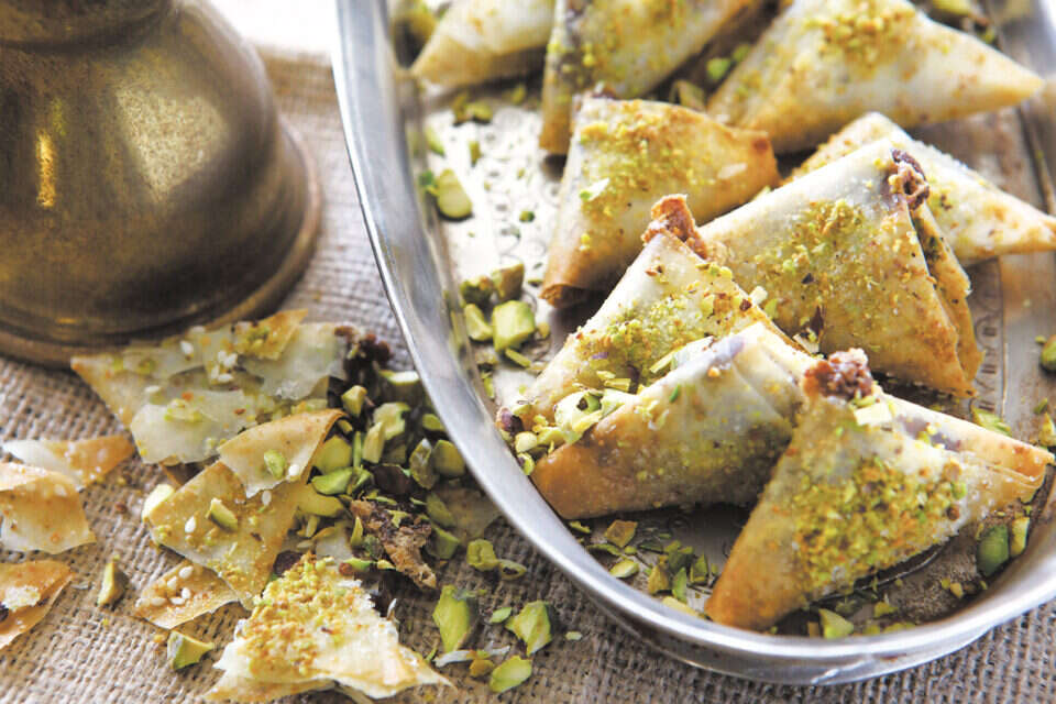 1. מפוררים את החלבה ומערבבים עם ממרח התמרים, הפיסטוקים הקלויים ומי הוורדים.