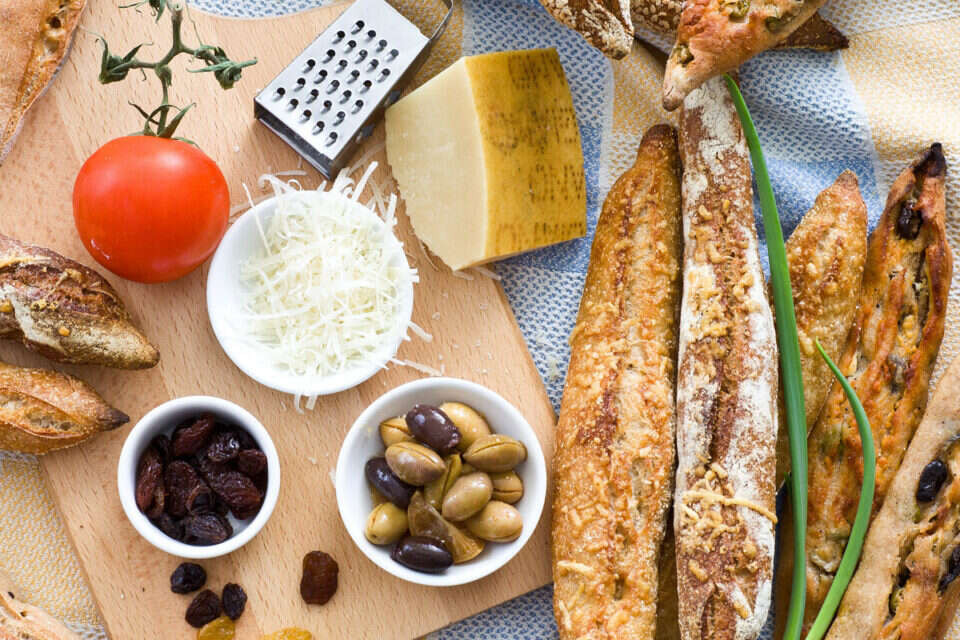 זהו לחם זיתים צר וארוך, וגם הוא נפלא לאירוח ולארוחות בוקר. את הבצק מכינים באותו יום אבל אפשר להשאירו במקרר יום־יומיים נוספים ואז לעצב את הפלוטים, להתפיחם ולאפותם.