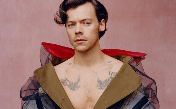 בצילומים למגזין בחרו עבור סטיילס בן ה-26 בגדים שמאתגרים את נושא המגדר, וכך בתמונה אחת הוא לובש בלייזר שחור ובתמונה אחרת עוטה שמלת קריוניולינה רחבה. סטיילס אף חושף את פלג גופו העליון, מעוטר הקעקועים, עליו מתנוסס גם קעקוע (בעברית) עם שם אחותו - ג'נה, שממש במקרה גם הצטלמה איתו להפקה עבור הגיליון.