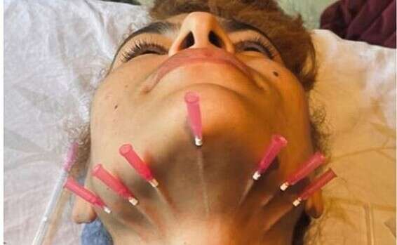 בתמונה, מנדז (46) נראית שוכבת על מיטת טיפולים, כשבין קו הלסת התחתונה שלה לאזור הצוואר נעוצות לא פחות משבע מחטים.