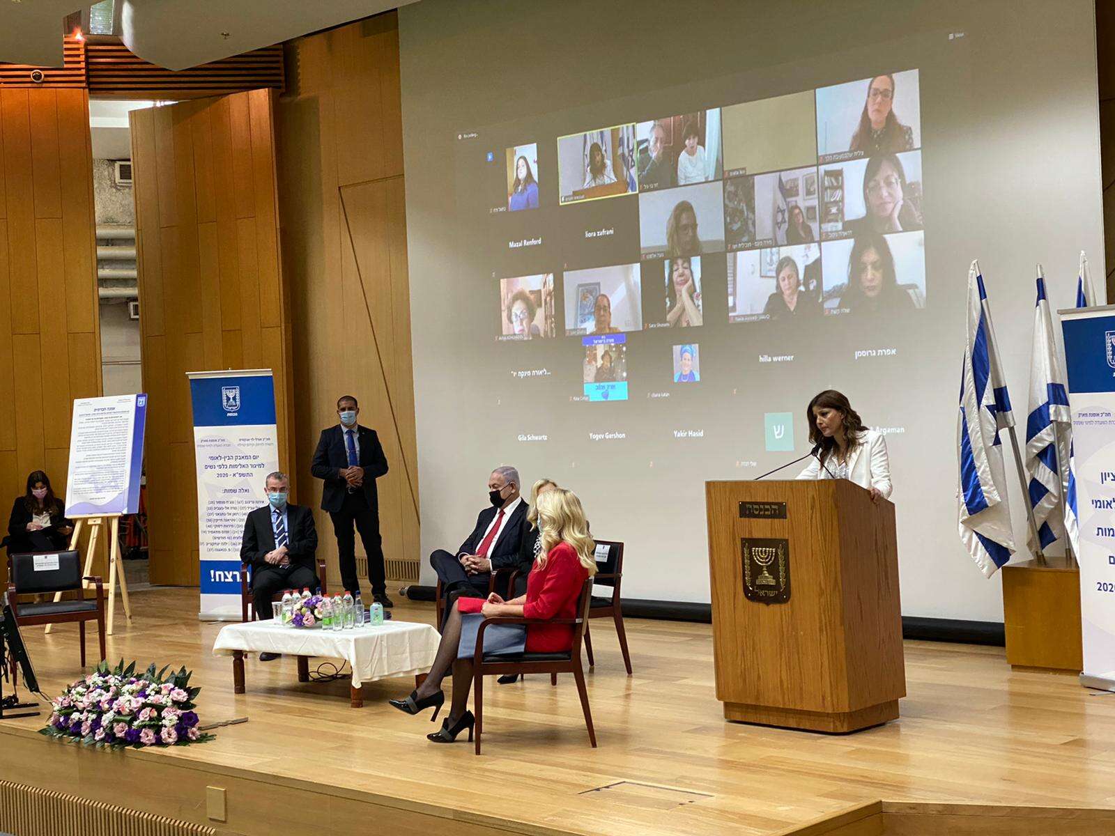 נתניהו הדגיש כי "אין זכות קניין לאף אחד על אף אחד בעת המודרנית. לכל אדם יש זכויות יסוד. האלימות נגד נשים יורדת אבל לא מספיק, אני שמח שבמדינה הצלחנו להוריד משמעותית את הסחר בנשים והגורמים השונים במדינה סייעו למגר את התופעה. עם זאת, עדיין יש רעה חולה והאלימות נגד נשים היא כזו. לפעמים התופעה הזו מתרחשת לעיני כל ולעתים בתוך בית. המשפחה צריכה להיות מקלט, היא הופכת לתא של טרור. ילדים ונשים חיים תחת אלימות וזה נורא לראות. זה קושר בין כולנו בחברה, אין הצדקה תרבותית לאלימות נגד נשים, להתעללות ולא לרצח. הם צריכים להיעלם מהעולם".