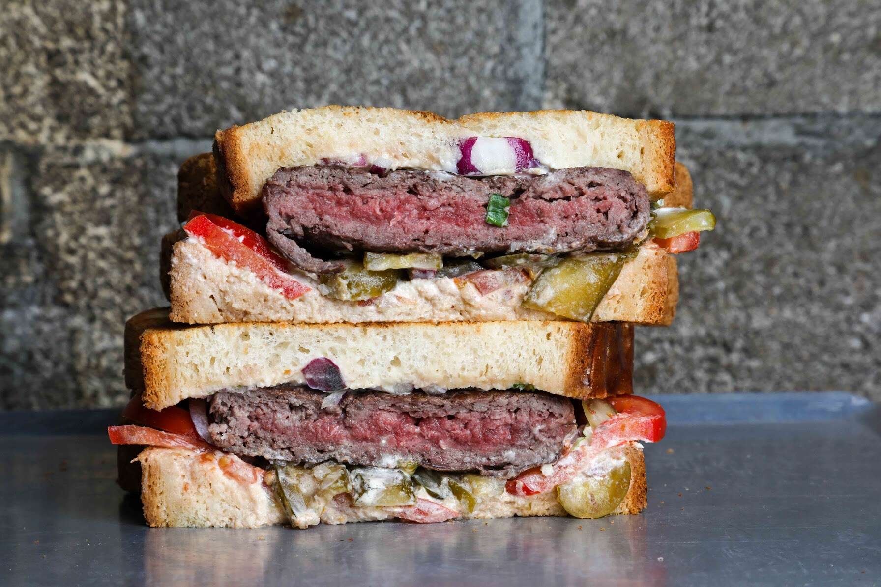 אז מה אנחנו אוכלים בעצם? שתי פרוסות גדולות של לחם לבן, עליהן איולי בגרסה קצת שונה, חמוצים, עגבניות וחריף. הקציצה עצמה היא 201 גרם של בשר בקר מעולה וכמעט נטול תבלינים. לטבעוניים יש קציצת פלאפל פחות או יותר באותו הגודל, מנה מסקרנת לכשעצמה.