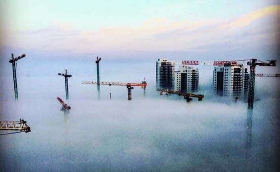 ככה נראים נופי הערפל ממרומי המנוף בפרויקט בנייה ברמלה