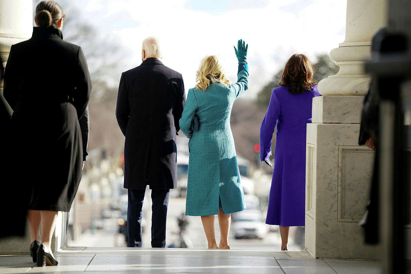האישה הראשונה החדשה של הבית הלבן ד"ר ג'יל ביידן לבשה טוטאל לוק בצבע טורקיז של מעצב האופנה הניו יורקי מארק אריין. המראה כלל מעיל מחויט בגזרת A מבד טוויד אלגנטי ומחויט עם צווארון משי עם שמלה תואמת מתחת שכללה צווארון בעיטור אבני סברובסקי נוצצים כשהיא השלימה את הלוק עם מסכת פנים באותו הצבע.