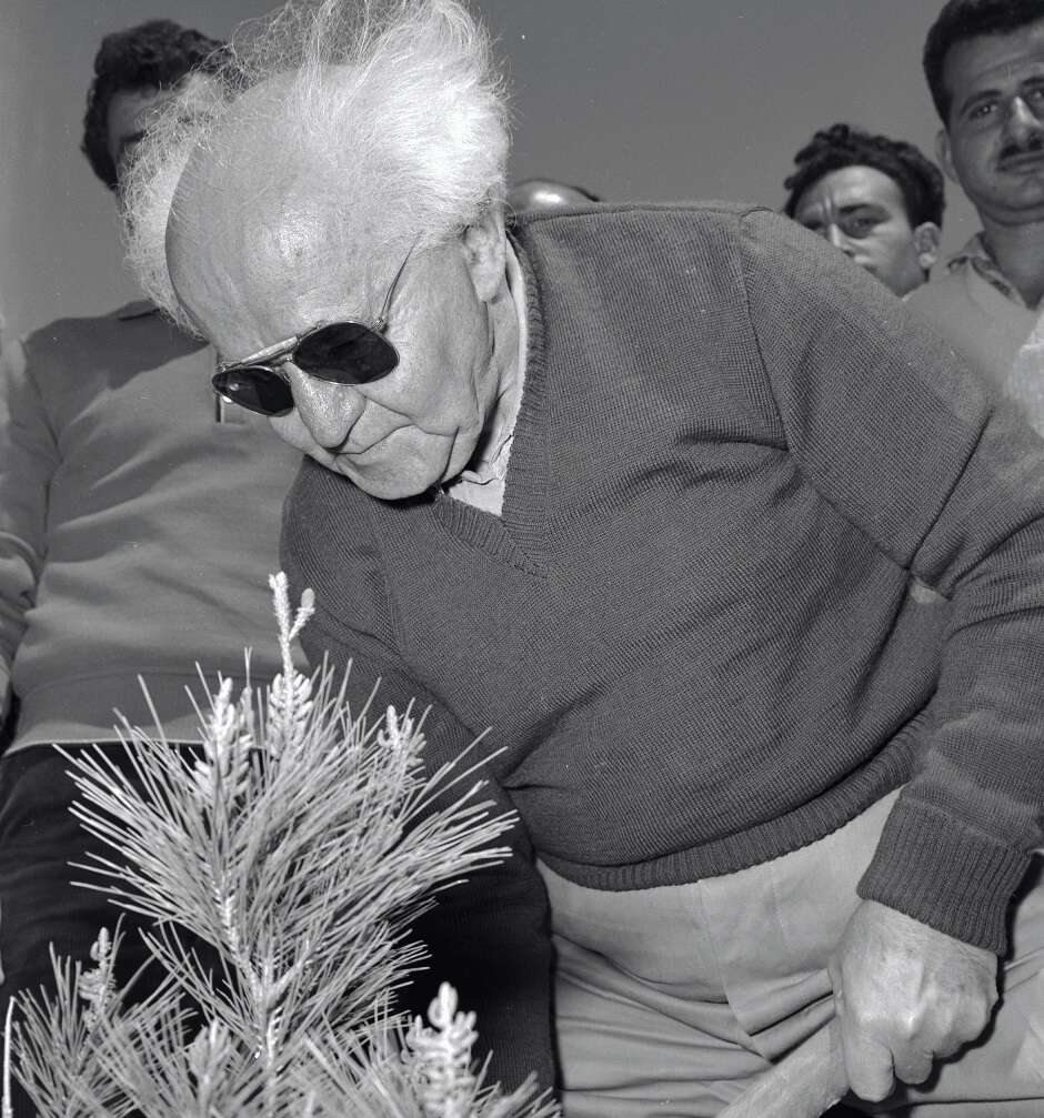 ראש הממשלה דוד בן־גוריון נוטע עץ ביער ע"ש אלוף אסף שמחוני ז"ל, ליד נחל עוז, 1959