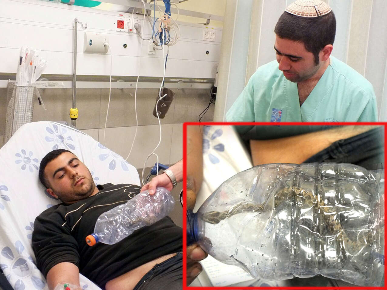 צילום: באדיבות ביה"ח פוריה // הצעיר בבית החולים. בהגדלה: הנחש הכלוא בבקבוק