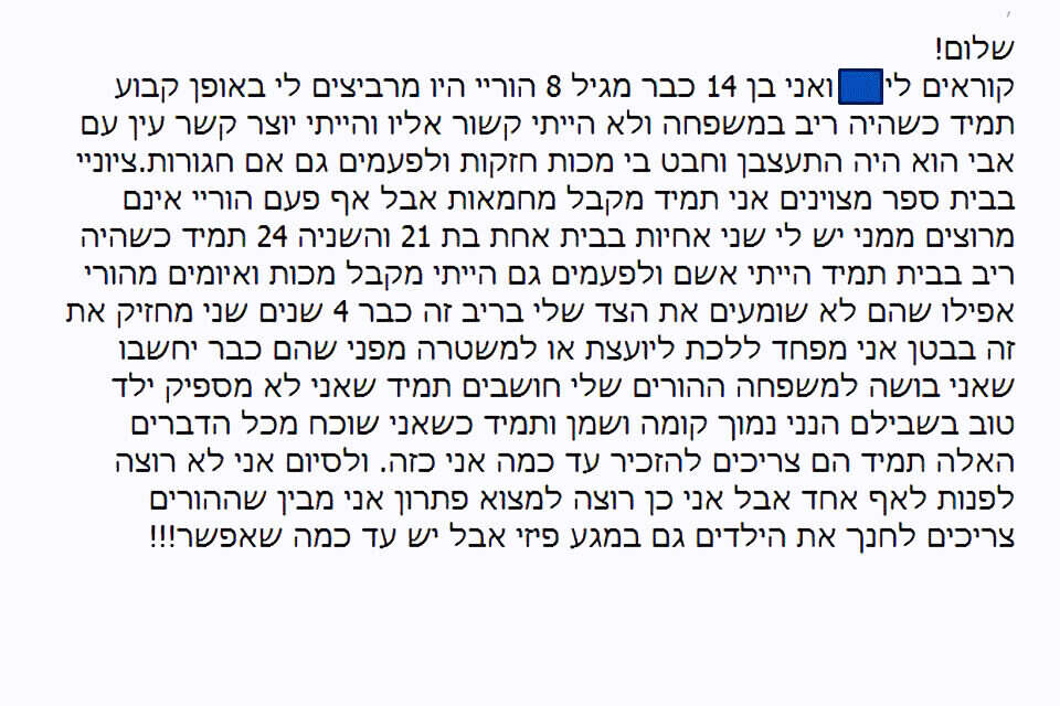 הגורם שמעורה בפרטי החקירה, סיפר כי מדובר בנער אינטליגנט שלא רצה לפגוע בהוריו, אך רצה להפסיק להיות קורבן להתעללות. ההורים לא הכחישו את מרבית הטענות שהופנו אליהם, והחקירה תימשך בימים הקרובים.