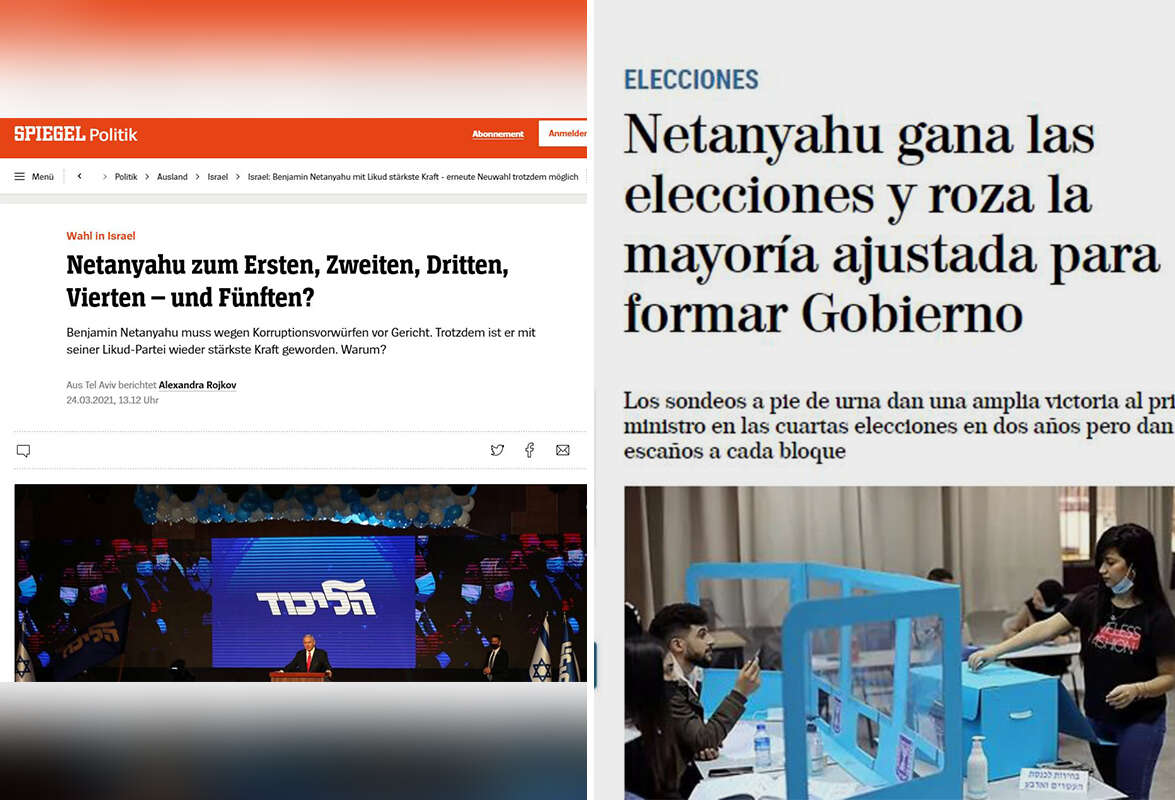 דר שפיגל הגרמני בחר בכותרת "נתניהו בפעם הראשונה, השנייה, השלישית, הרביעית והחמישית?", עם רמיזה עבה לבחירות נוספות. מעניינת במיוחד הייתה הכותרת של הניו יורק טיימס האמריקני, אשר דייק עם השאלה הרווחת בחברה הישראלית: "לאחר בחירות רביעיות בשנתיים, הישראלים תוהים: מתי זה ייגמר?"