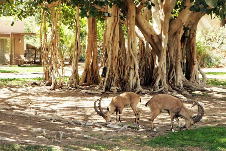 ישבתי במרפסת החדר, והבטתי בנוף המדברי שנגלה אלי במלוא עוצמתו. הרי המדבר האדומים־כתומים, שאת ליבם חורץ בחוצפתו נחל ערוגות. ביני לבין הנוף האלמותי מפרידה גדר אבן נמוכה. מצמוץ קטן והנה קופץ עליה יעל רברבן. ועוד לפני שאני מתאוששת מהמראה, מגיח עוד אחד, ושניהם משחקים משחקי יציבות על הגדר, מדי פעם יורדים לטעום עשבי תבלין שגדלים כאן, וחוזרים לקפץ להם בחדווה. פשוט מקסים.