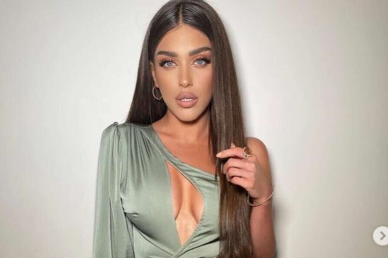 אלמוג חדד במראה טרנדי של חליפה בגוון ניוד, ז'קט מעטפת קצר, חצאית מיני וסנדל עקב. לוק מונוכרומטי שנראה מעט חיוור .