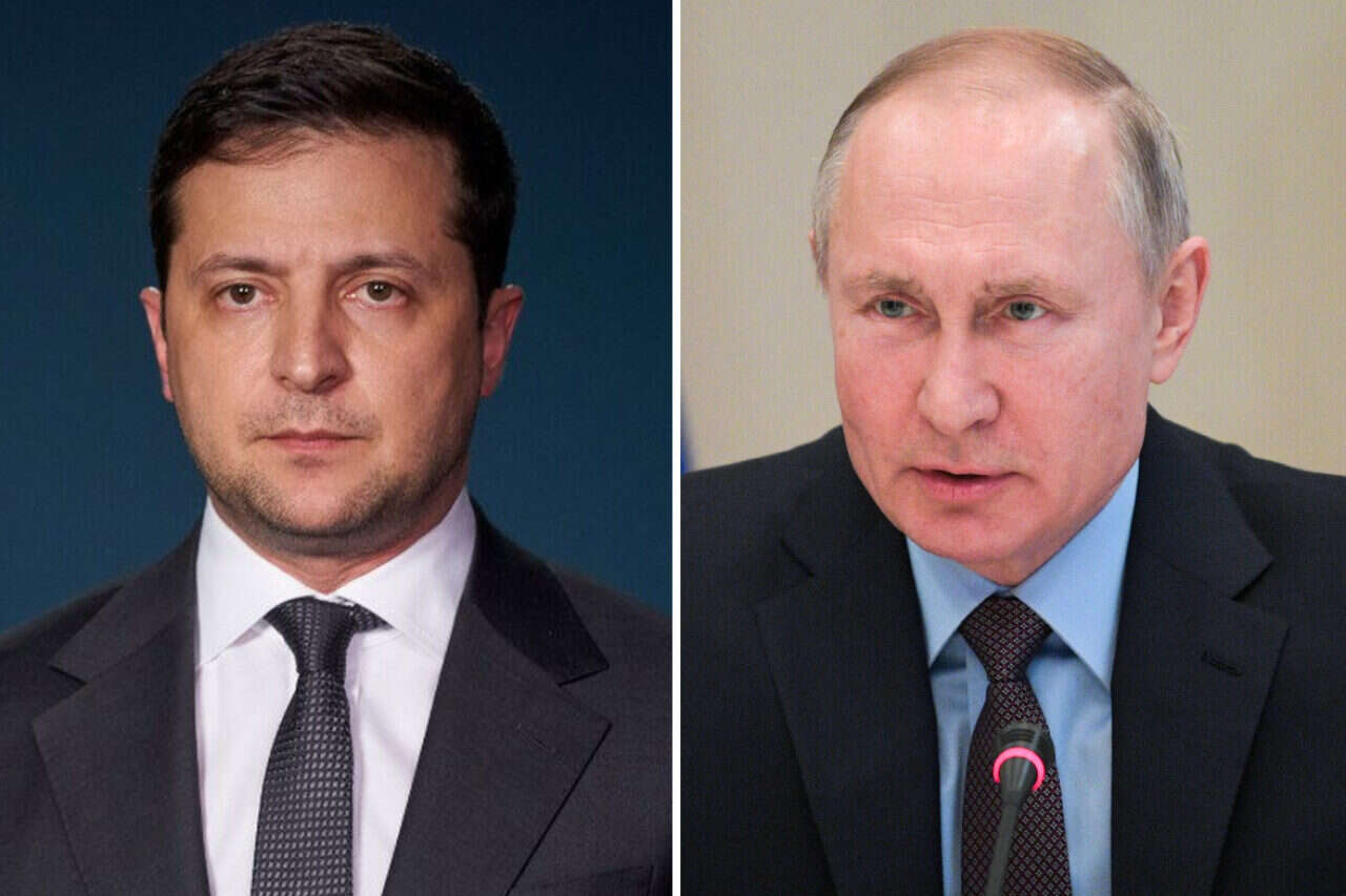 נשיא רוסיה פוטין ונשיא אוקראינה זלנסקי. הרוסים ממשיכים להתקוטט עם נאט"ו, צילום: רויטרס, אי.אף.פי