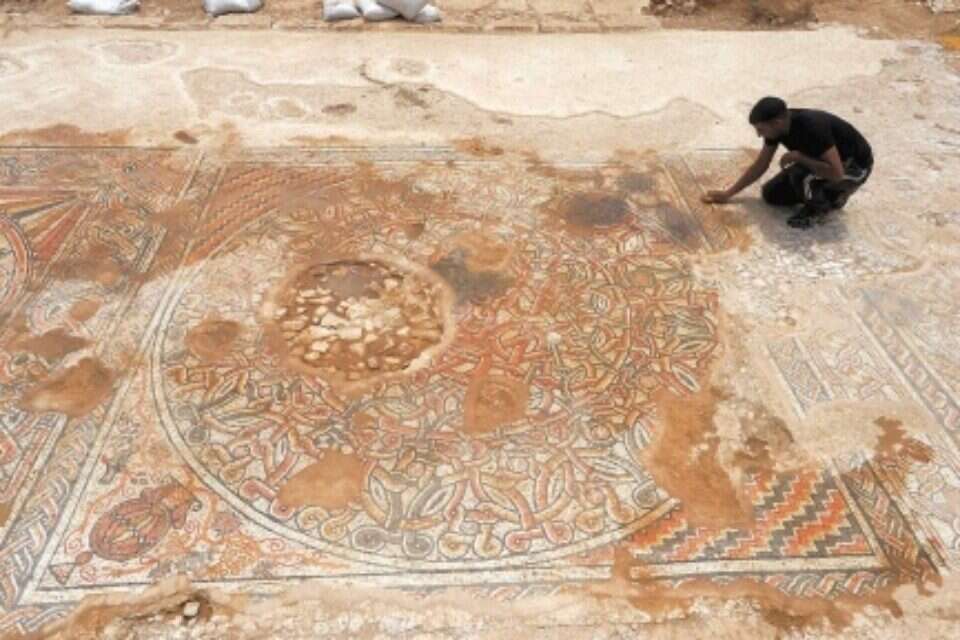 A splendidly colorful mosaic, some 1,500 years old, was discovered recently in an open field near Kibbutz Beit Kama, located in the Bnei Shimon Region Council in the northern Negev. The mosaic, which has been traced to somewhere between the fourth and sixth centuries in the Common Era, was discovered during an archeological dig conducted by the Israel Antiquities Authority before the paving of a new highway interchange. During the excavation, managed by Dr. Rina Avner of the IAA, the remnants of a village the size of six dunam (1.5 acres) was discovered. The mosaic, which adorns the floor of one of the structures, was preserved in good condition. It is geometrically designed and in its corners one can see amphoras (a type of jug used to carry wine), a pair of peacocks and a pair of doves pecking grapes on a vine. The finding hints that the structure was a public building. "These designs are common and known to be from this period, but the mosaic is unique due to the large number of motifs incorporated together," said Dr. Yigal Yisrael, the IAA's chief southern district archeologist. Yisrael added that a water pool was discovered at the entrance to the building, with a trench system running between them, and that during the Byzantine period Jewish and Christian communities lived side by side in the area. The Antiquities Authority is currently exploring what the structure and water pool were used for, as they seem to have been the focus of considerable financial resources. Following the Shavuot holiday, the IAA will open the excavation site to the general public.