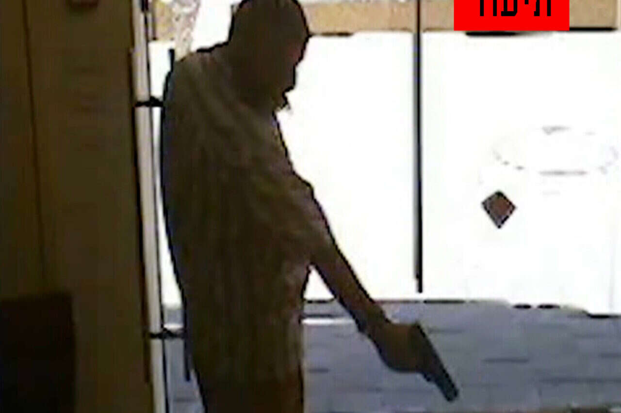 11:34 - לבוש חולצה משובצת וכובע לראשו, אלון נכנס לסניף הבנק. בתיק השחור הוא מסתיר אקדח גלוק, שהחזיק ברישיון.