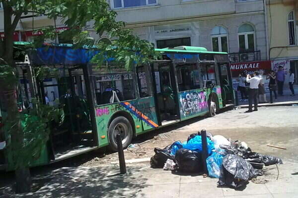 צילום: דניאל סיריוטי, שליח "ישראל היום" לאיסטנבול // אוטובוס שהושחת בכיכר טקסים