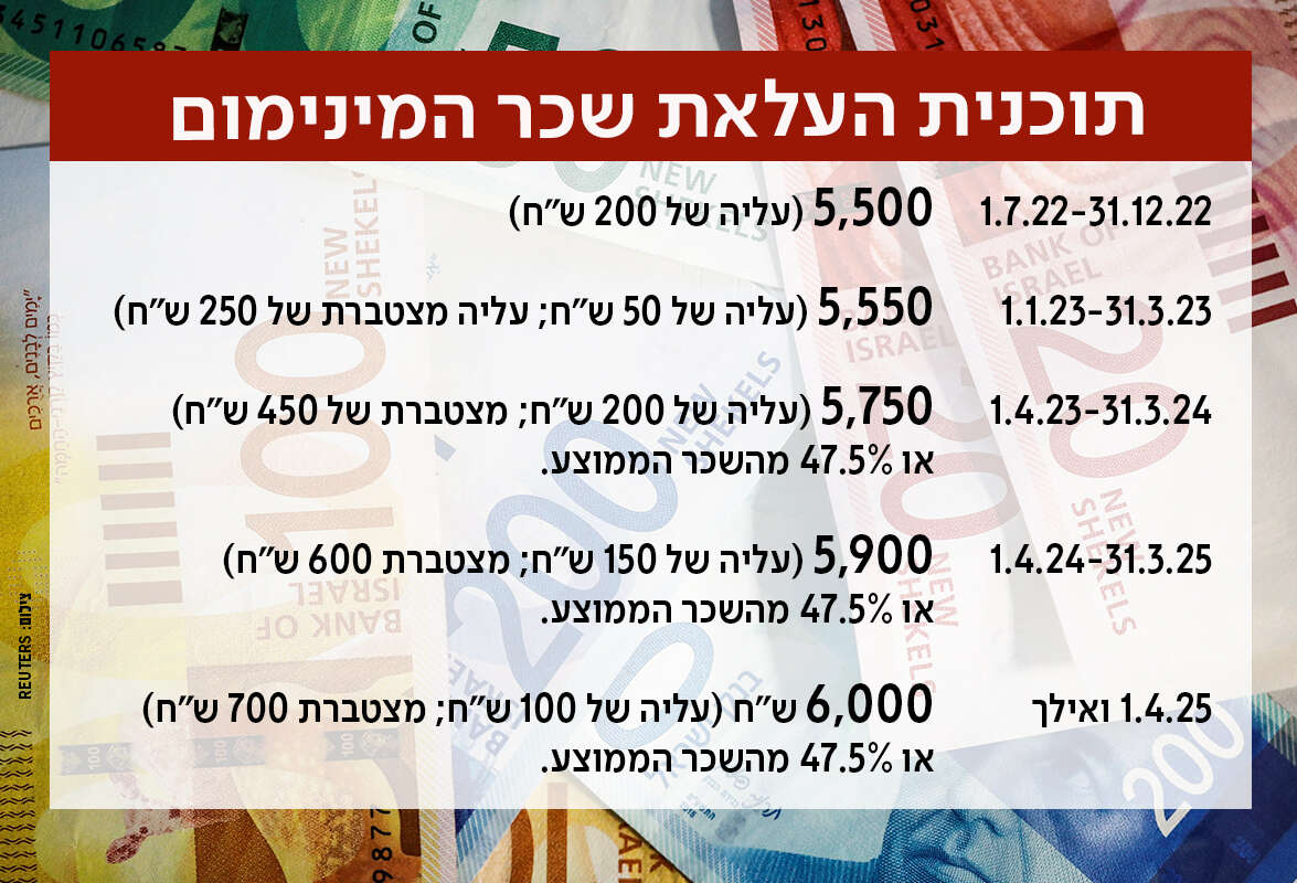 לפי הצעת רייטן, שקיימה לאחרונה דיונים גם עם משרד האוצר וגם עם ארגוני המעסיקים במשק, שכר המינימום יעלה עד סוף השנה ב-250 שקלים, מ-5,300 שקלים כיום ל-5,500 שקלים, בעוד 50 שקלים עד סוף הרבעון הראשון של 2023, וכך הלאה עד שיגיע השכר המינימלי לרמה של 6,000 שקלים בסוף הרבעון הראשון של 2025 או 47.5% מהשכר הממוצע במשק – הגבוה ביניהם.